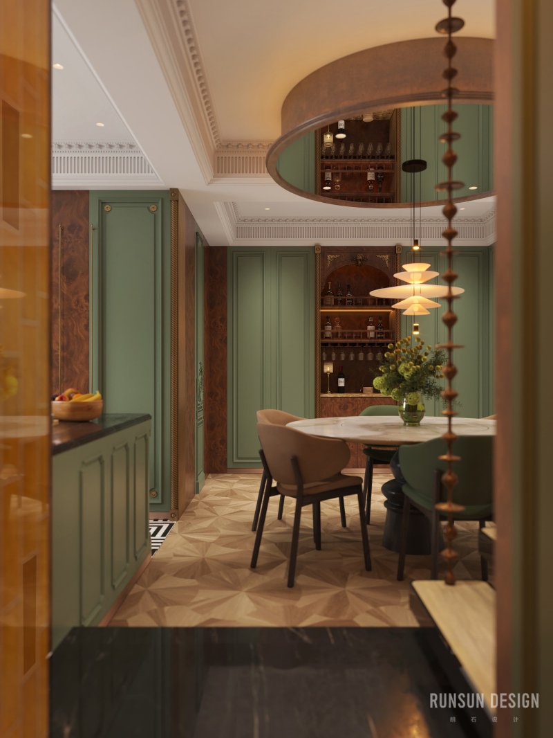当天花板的圆形镜面映射出餐桌边家人团圆的笑靥