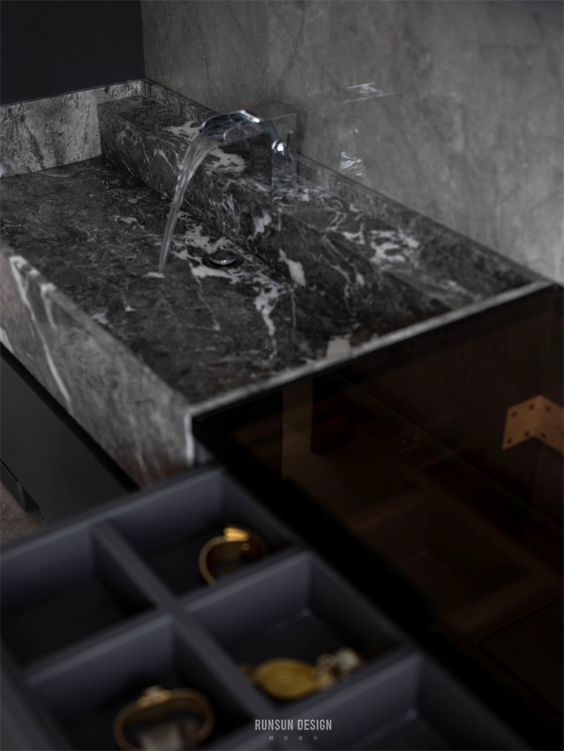 本案在设计过程中,我们为了营造更加时尚的氛围,运用各类材料打造光影投射的效果,使得最后的落地效果更具有时尚感与空间感。