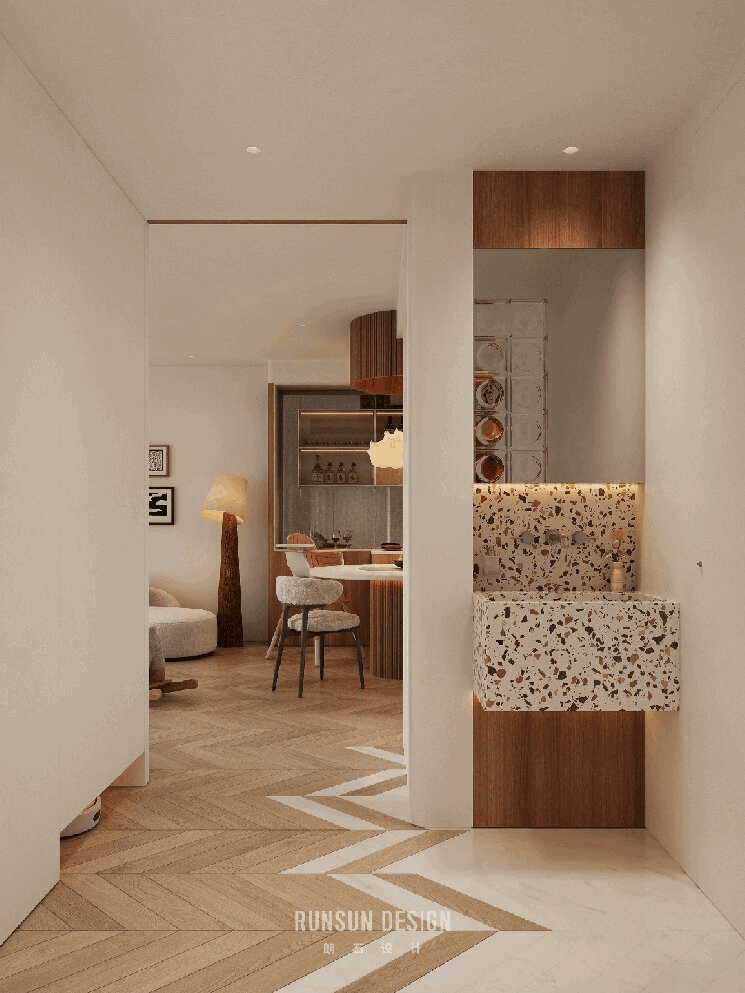 地面的鱼骨拼花木地板与饰面遥相呼应