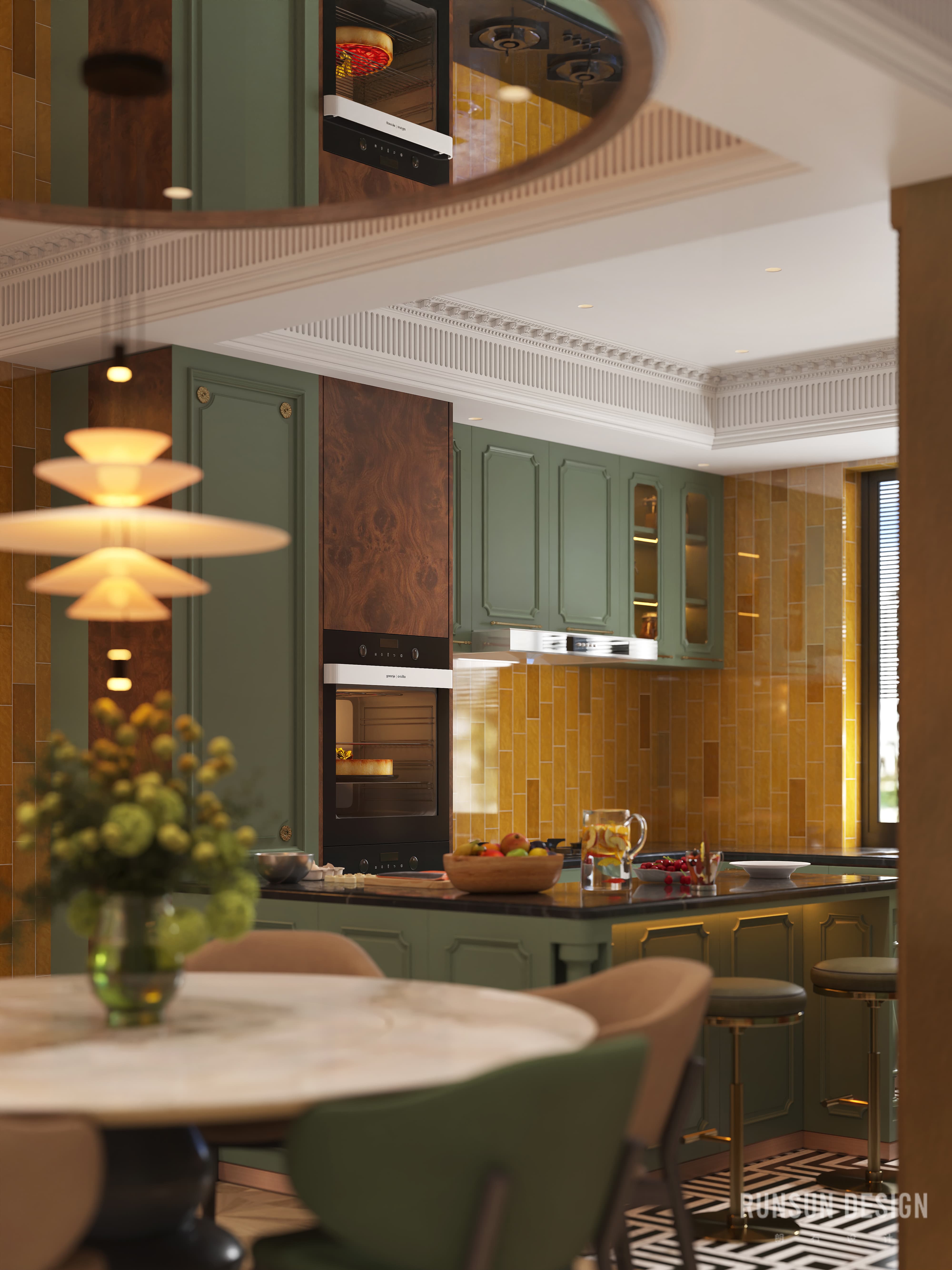 当天花板的圆形镜面映射出餐桌边家人团圆的笑靥