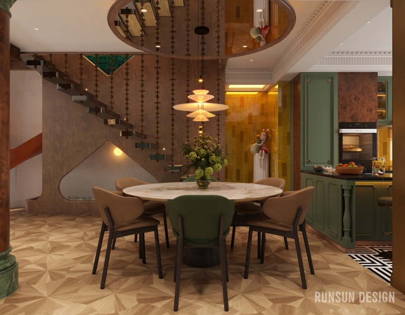 当天花板的圆形镜面映射出餐桌边家人团圆的笑靥