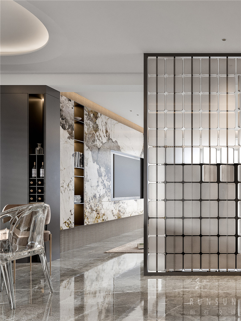 运用独特的玻璃材质与金属结合打造的玄关,将室内所有的风华遮掩起来。如淡云飘过明月般,朦胧且富有诗意,含蓄内敛、风华斐然。