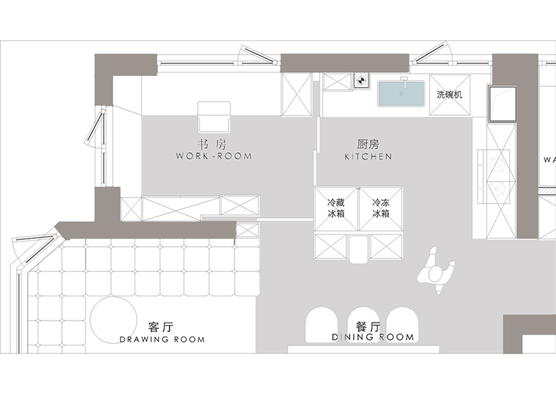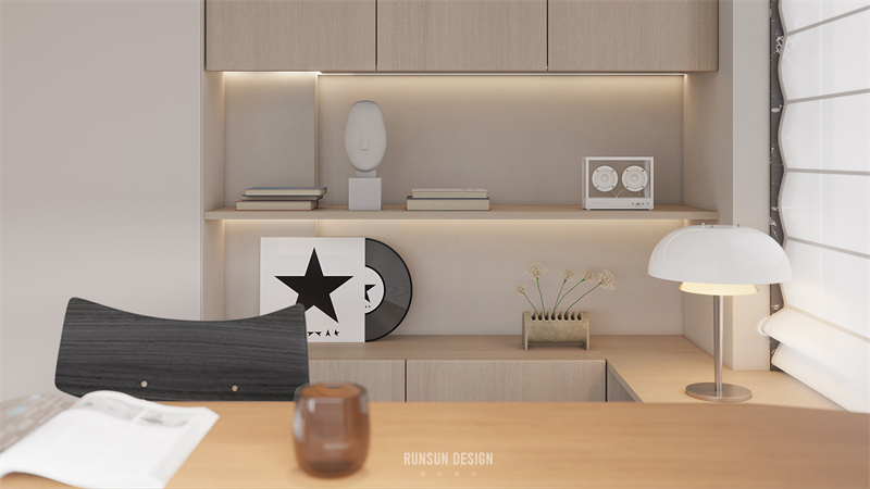 这是一套小户型的空间,设计立意是将空间扩大。我们再客厅、餐厅、厨房与书房分别坐落在一个悬空柜子的四周。它们是互通的四个空间,又可通过移门隔断形成独立空间。围绕着悬空柜走上一圈便可体会它的意趣。