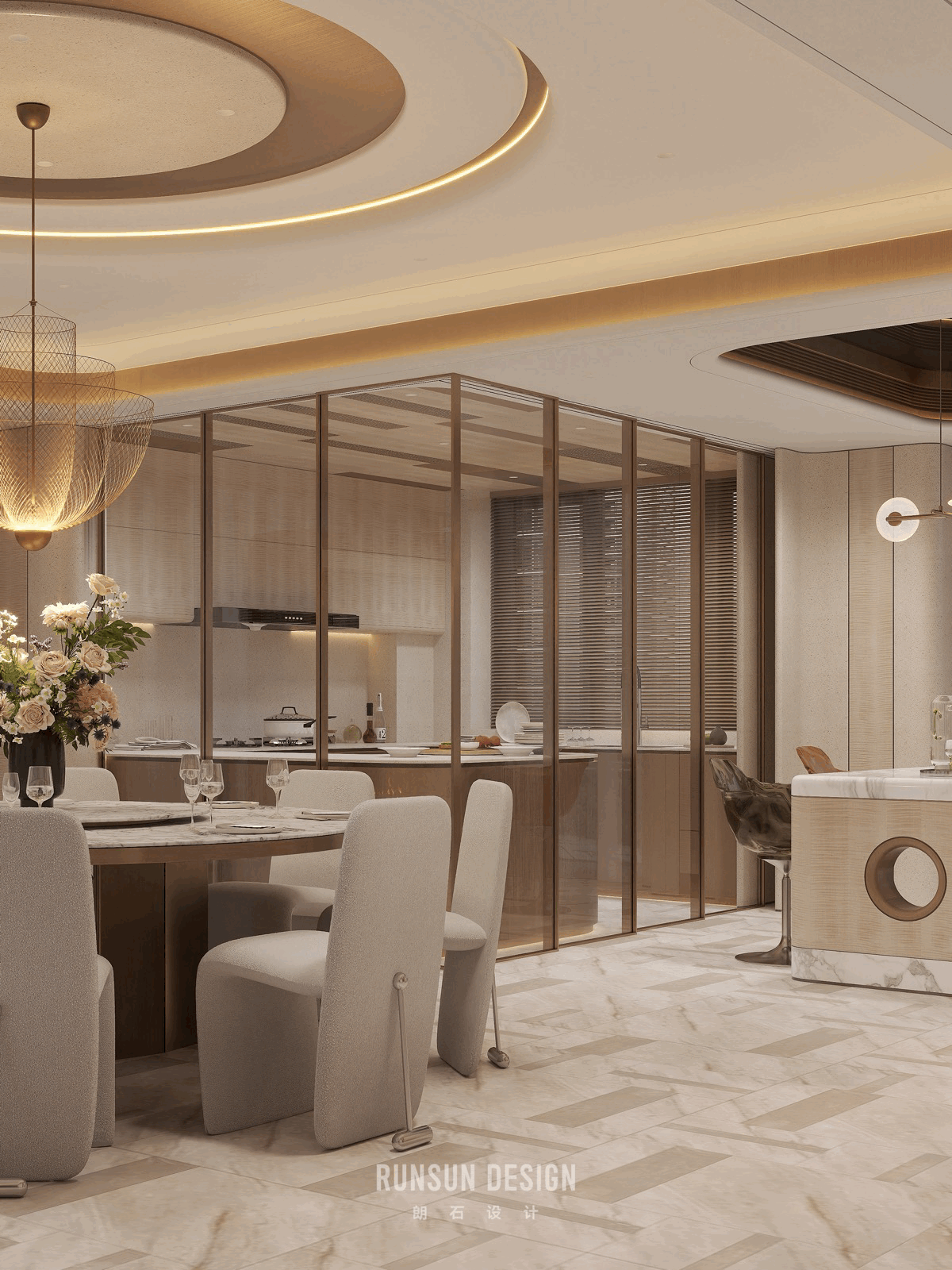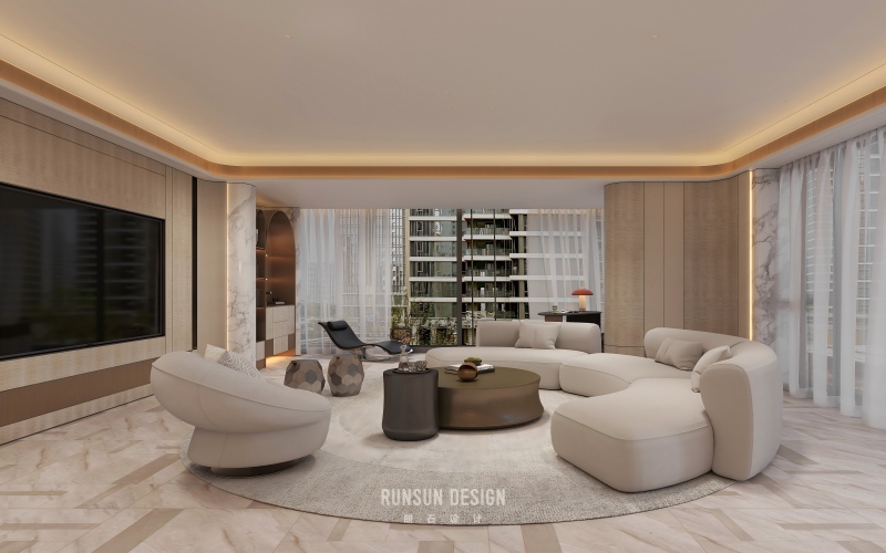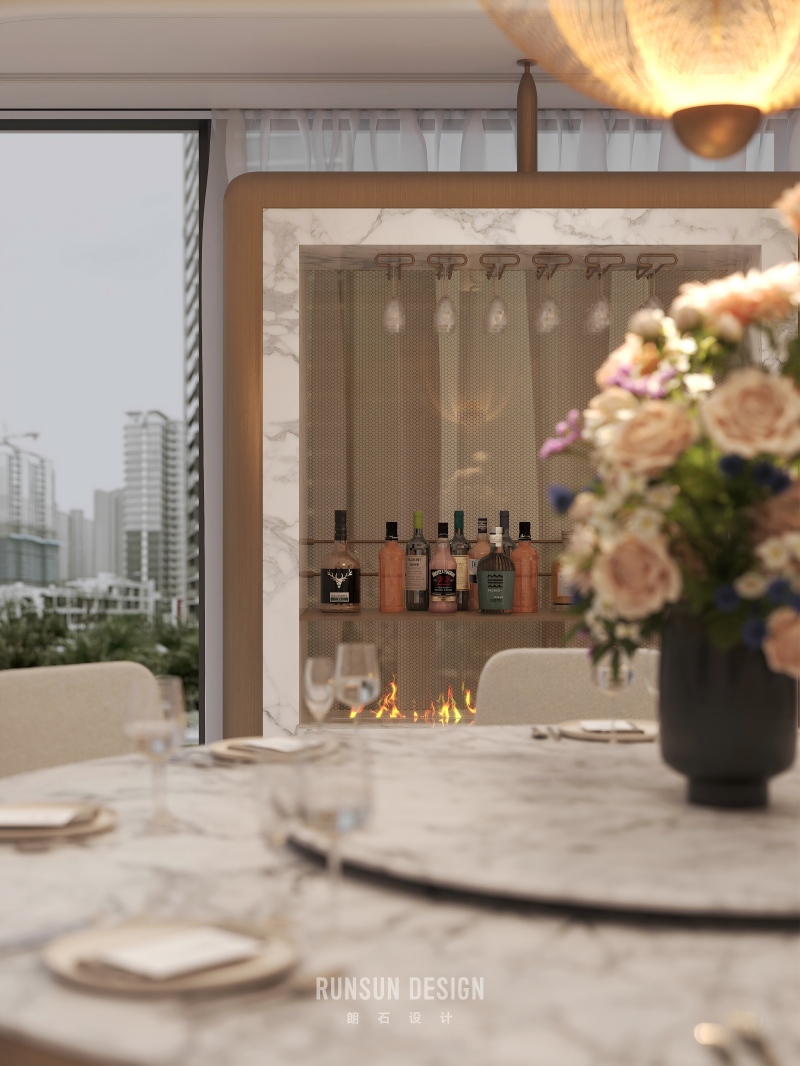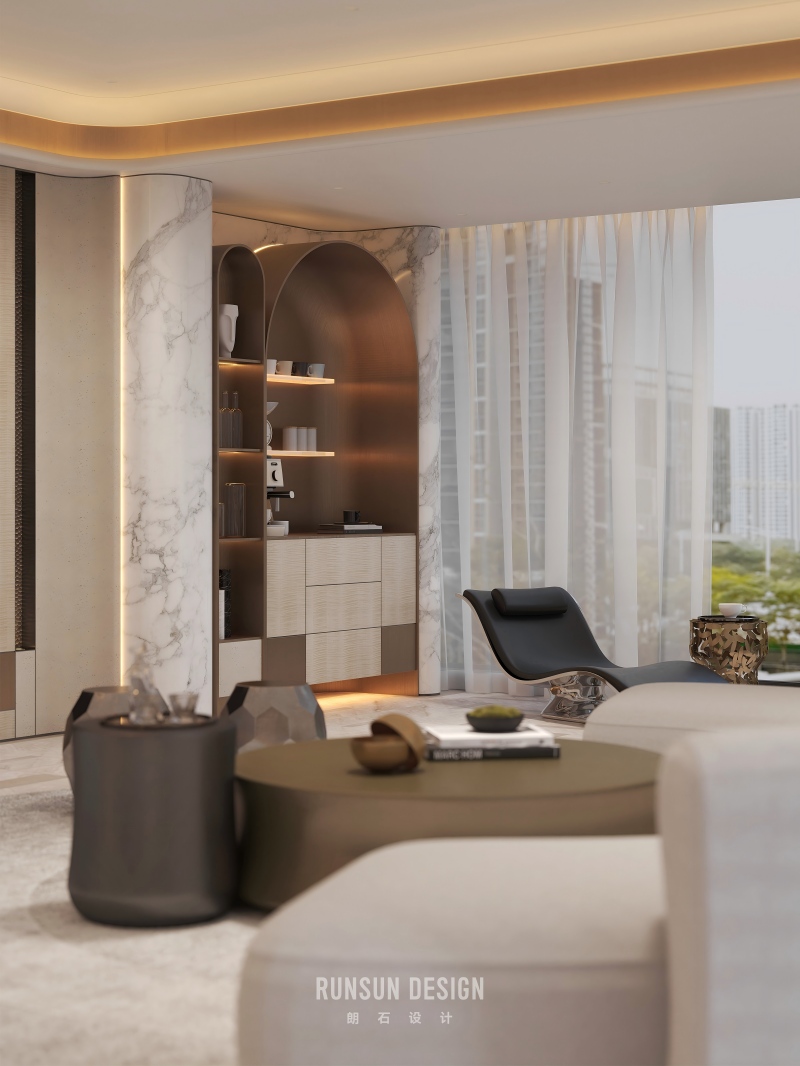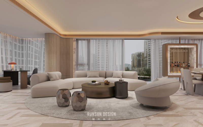 巨大的落地窗将都市天际线框成一幅流动的巨幕