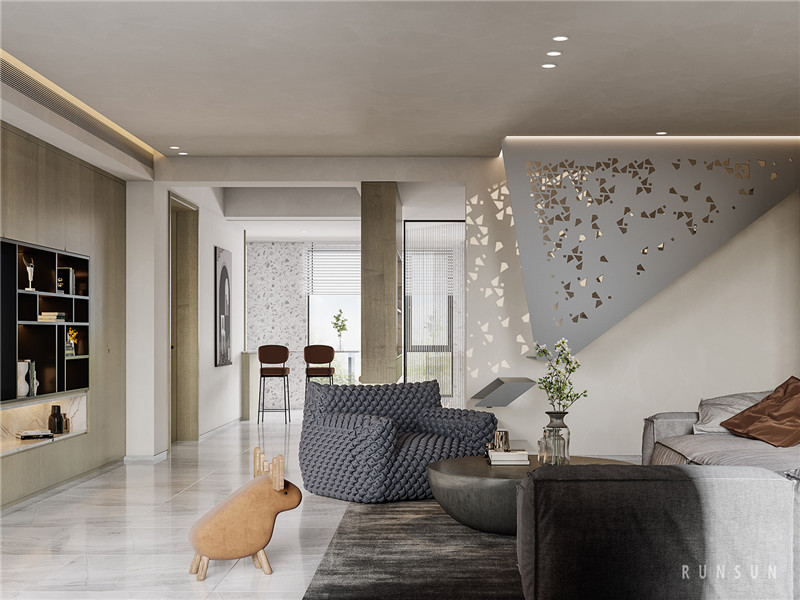 In this set of space, we have upgraded the urban plot artistically, and made the stairs a highlight of the whole space. The hollowed out iron stairs are transformed into a flying butterfly in the light of the lights, swaying in the intoxicating rrzcms space.