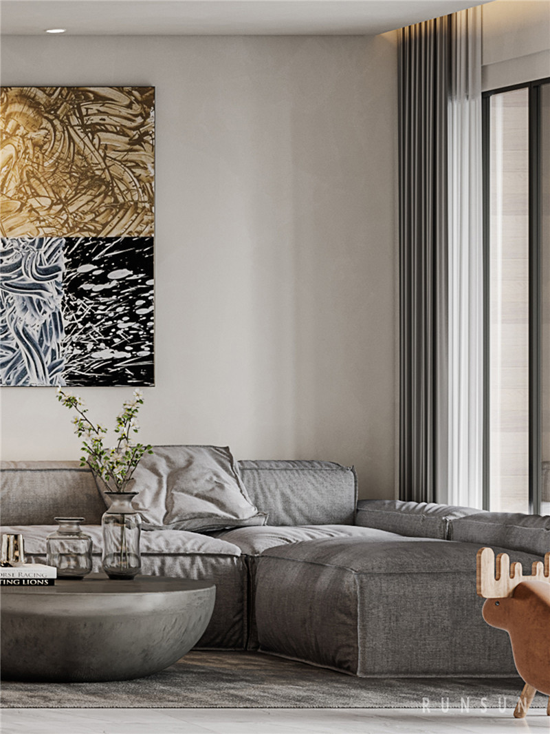 在空间中,为了使用的便利,我们从设计上将门的开启方式与材质做了一些特殊变化!比如餐边的转角柜可以呈现双面开启状态,更便宜取物品。比如阳台的折叠门,我们运用透明的玻璃材质与墙布硬包材质做了相得益彰的连接,原本以为固定的墙壁原来也能和玻璃门一起折叠开启,使得空间更加妙趣横生。