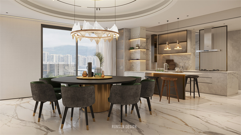这套房子的玄关,首先是一个狭长的走道,然后再由小及大,连接一个较大的空间。故此我们引入中国传统建筑中“中庭”的概念。玄关以中庭天井为原型,置苍穹于顶面,四方造有亭台倒影、碧澜、湖石映衬下,又宛似水中倒影,醉后不知天在水,天水相依,意趣无穷。