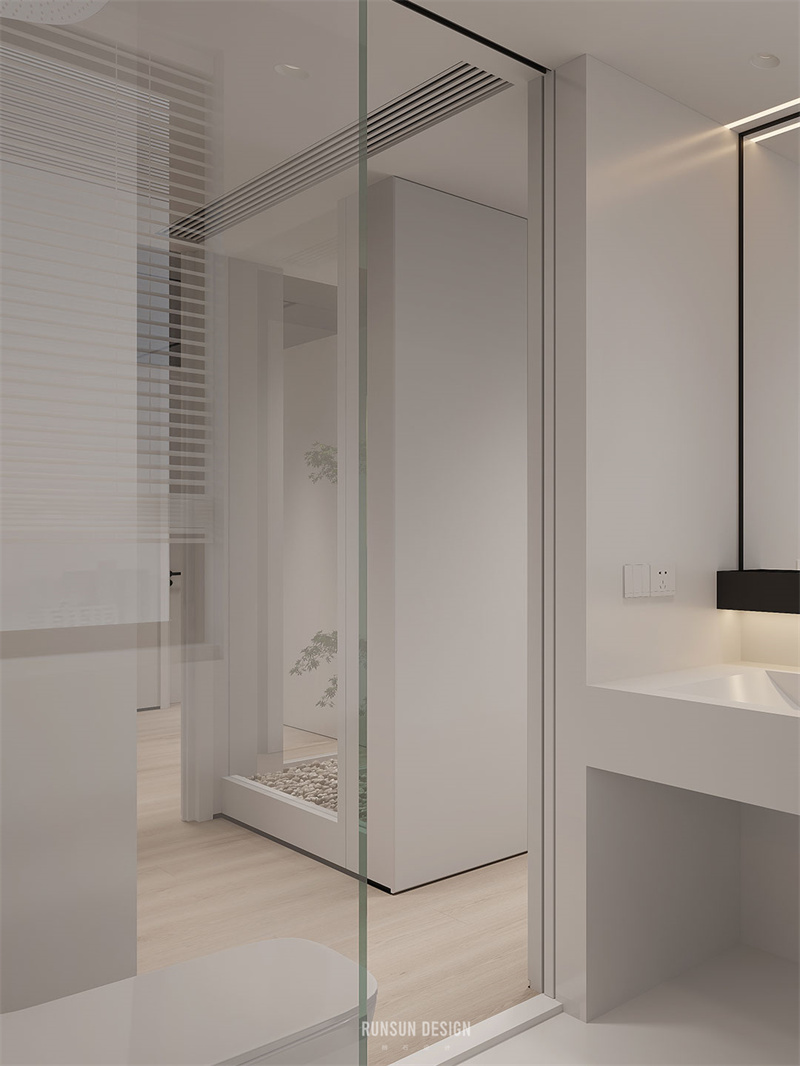 在私区(卧室区域)的走廊尽头,我们以一颗植物端景的设计联通各个空间,通过通电雾化玻璃的形式保证私密性。当玻璃全部开启时,会发现人在各个区域穿梭的影像,仿佛空间没有尽头。正是“平芜尽处是春山,行人更在春山外”。