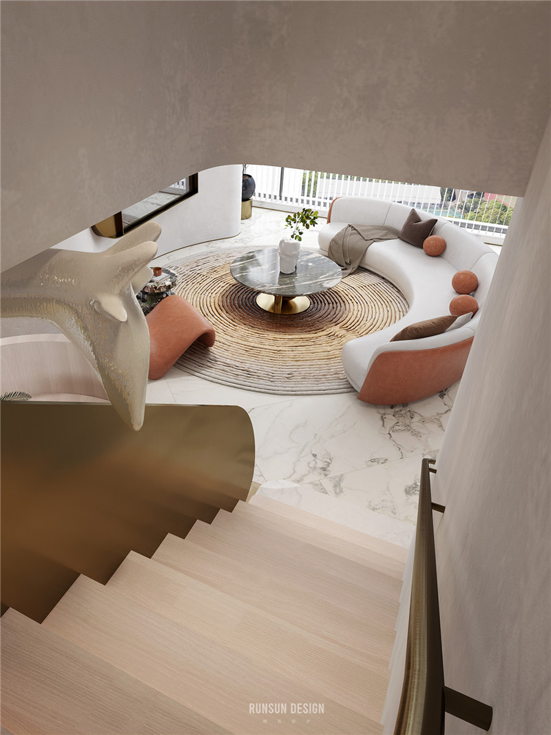 我们在楼梯空间中设置上下两个壁龛,通过吊灯将光线穿透两个壁龛。将这种灯光氛围在一层与二层的楼梯间中传导,形成整体的氛围感。使得整个空间灵动自然,妙趣横生。